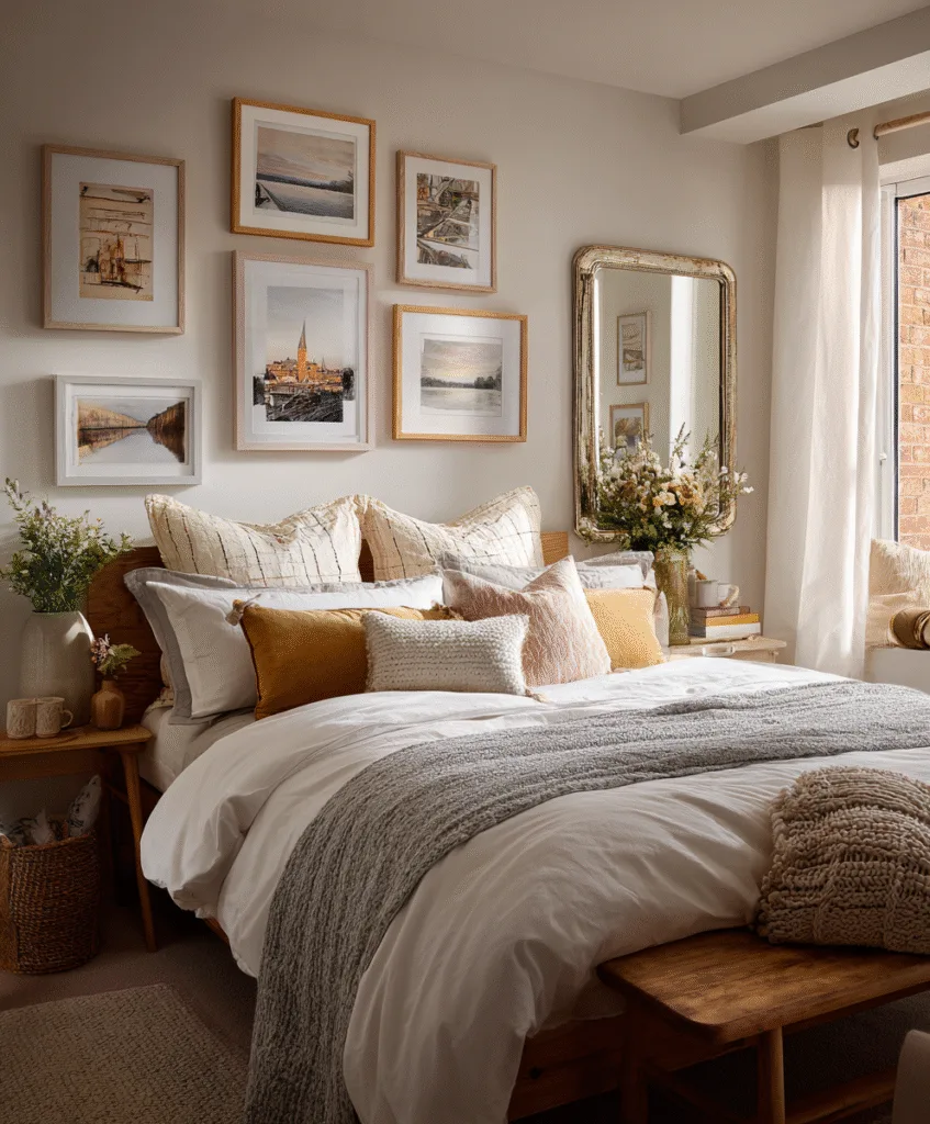 Start with just 4–6 pieces. I mixed photos, a small mirror, and a quote print. I laid them out on the bed first before hanging.