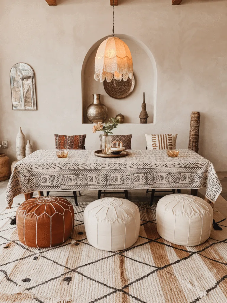 - Look for Moroccan poufs, Turkish rugs, or African mud cloth pillows.