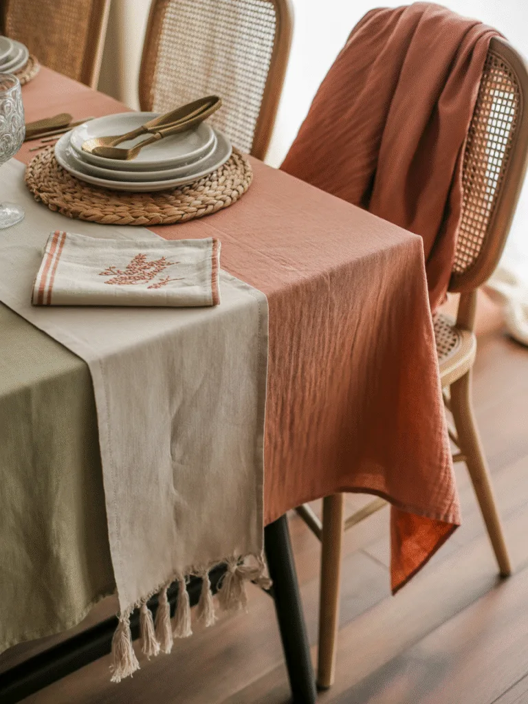 I love layering textiles in the dining space, throws over chairs, soft table runners, and cloth napkins can make the room feel extra special.