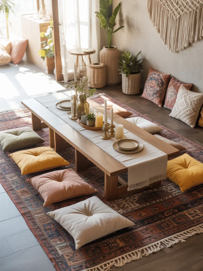Okay, this one’s for the bold—but trust me, low dining setups are the epitome of relaxed boho energy. Think Moroccan tea room meets Sunday brunch.