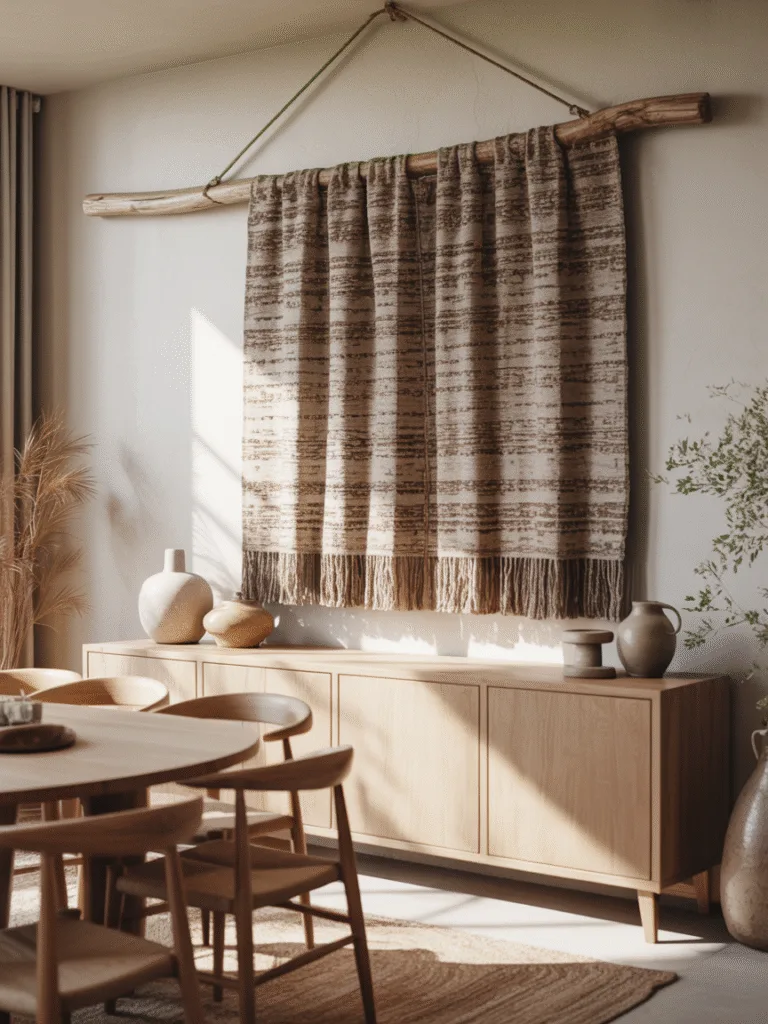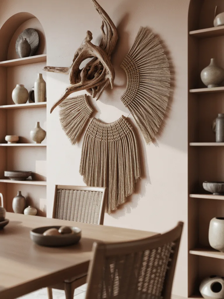- Try a woven wall hanging, oversized macrame, or driftwood sculpture.