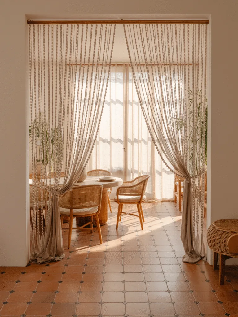 Replace traditional doorways or closet doors with beaded or fabric curtains to soften the space and add movement.