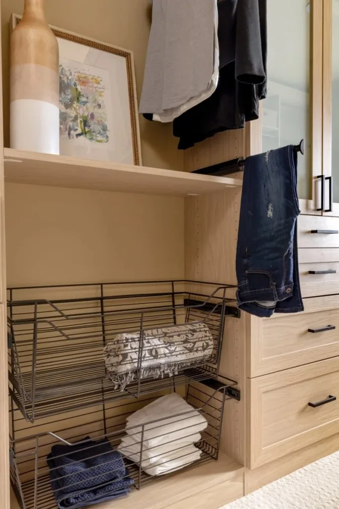 Wire baskets are a must-have. I use them for storing folded scarves, sweaters, and towels while keeping them visible and airy. No more pulling apart piles to find what you need.