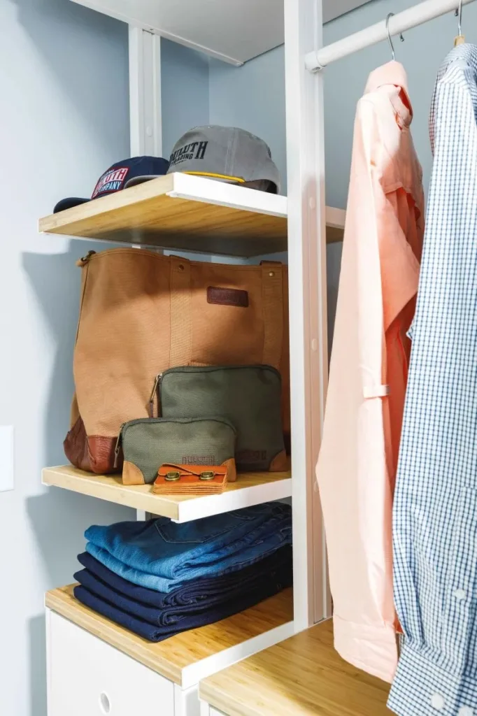 Fitting shelves in corners prevents the “dead space” problem and keeps items visible yet out of the way. It’s compact and efficient, even in a small closet.
