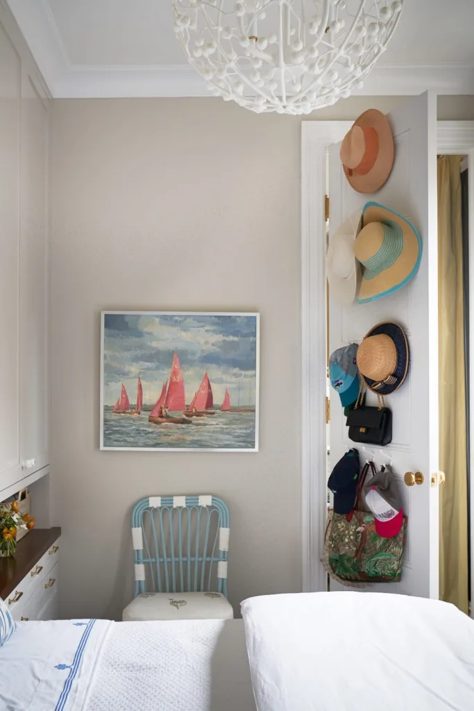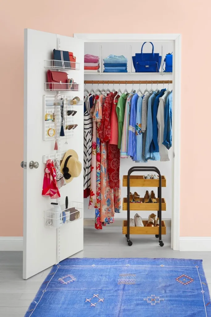 Hooking your hats and smaller bags onto the back of your door is super simple and frees up closet space. I’ve done this with colorful hooks, and it keeps everything visible and convenient.