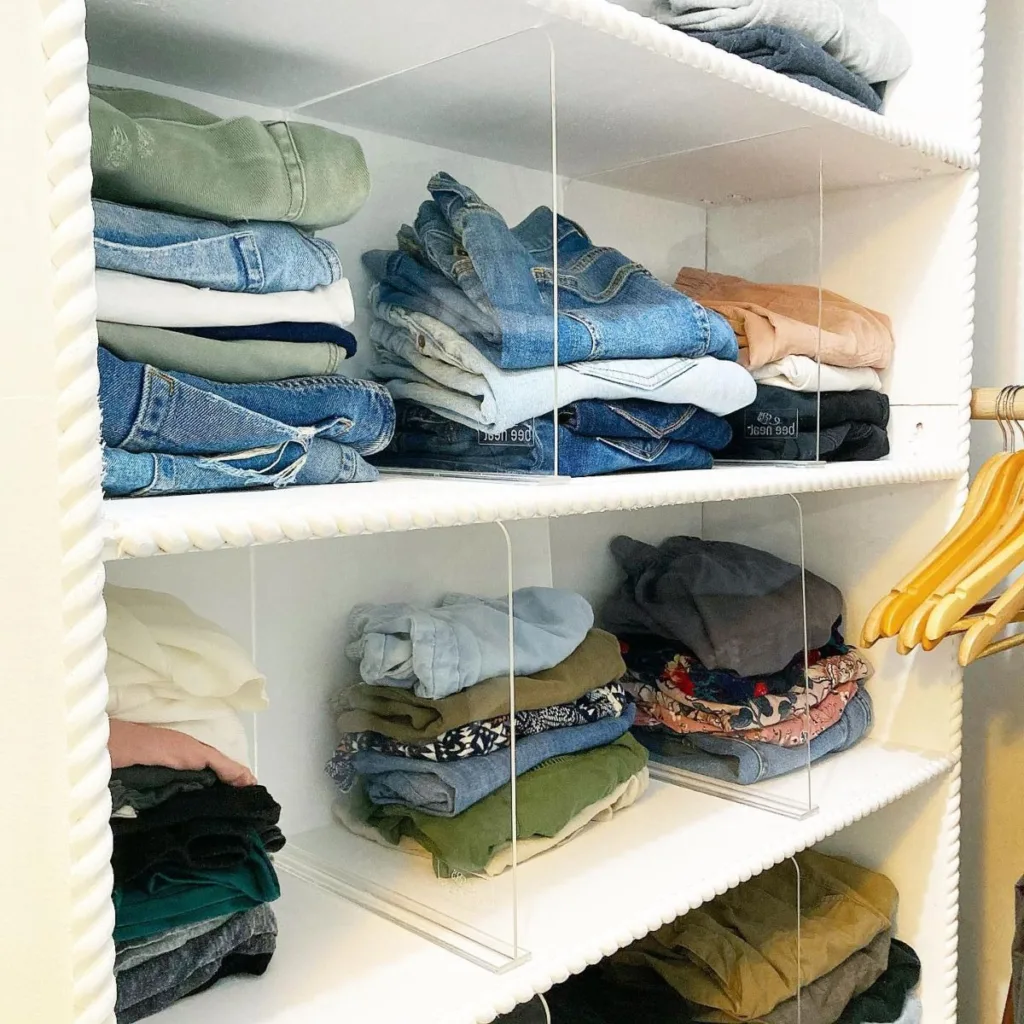 Shelf dividers are life-changing when it comes to vertical storage. They help you stack neatly without items toppling over, which is perfect for tees, jeans, or towels.