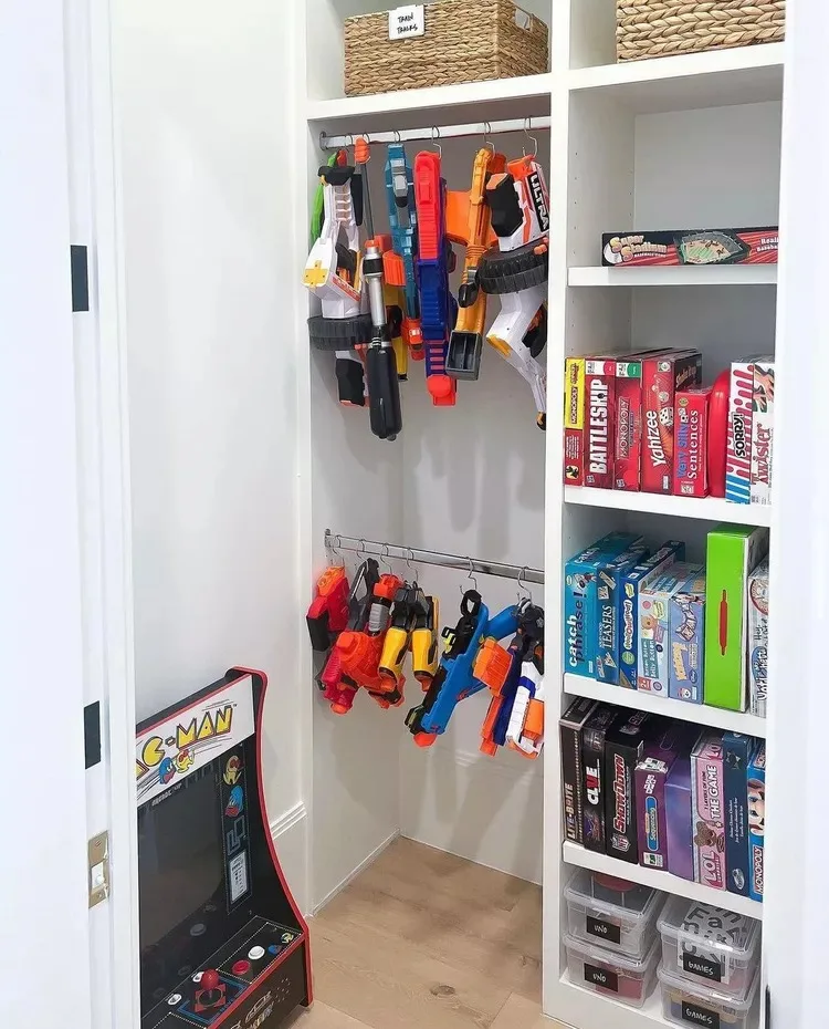 Hanging toys on closet rods or hooks is a genius way to keep them organized and off the floor. I’ve done this in my kids’ rooms, and it prevents toys from being scattered.