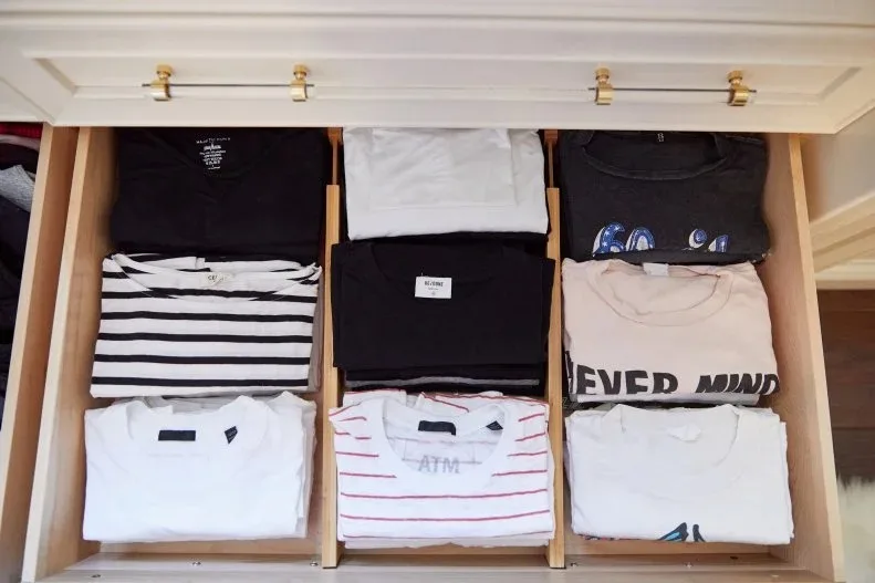 It all depends on your space. If you’ve got extra drawer space, definitely fold them—Marie Kondo-style vertical folding saves room and helps you find every shirt.