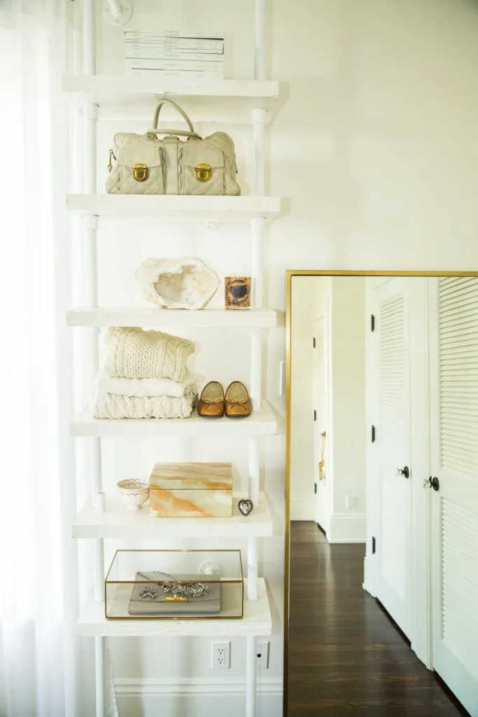 Wall shelves are my favorite way to make use of underutilized space. I use mine to store bags or display shoes. And adding those little decorative touches, like a small urn or framed photo, makes it feel special.