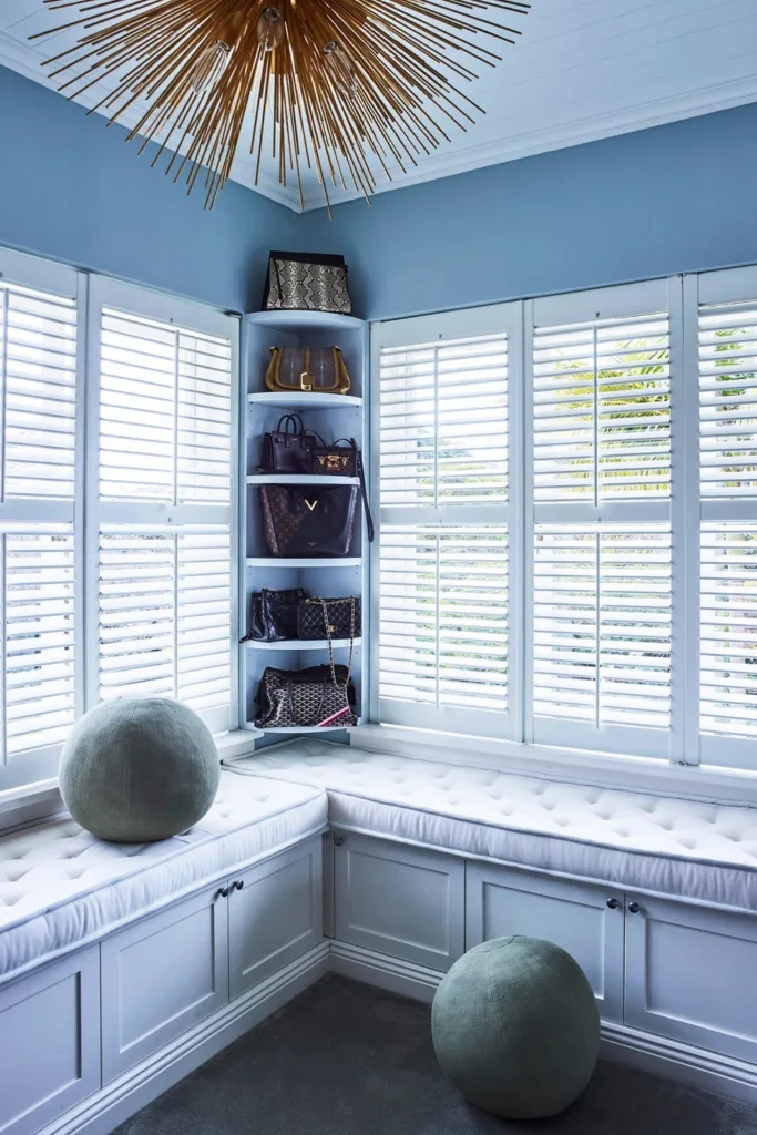 Not only do these shelves hold bags neatly, but the bench seating below makes it feel cozy and functional.