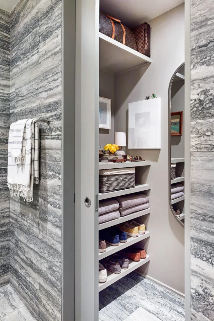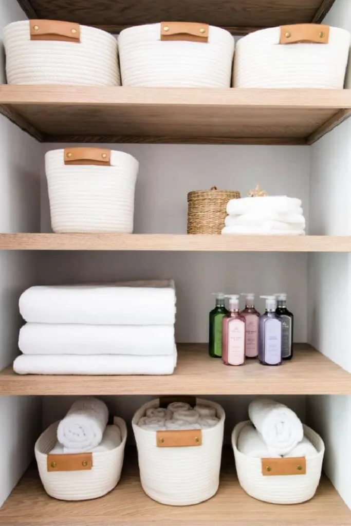 This closet shows how neatly they store towels and accessories. Baskets like these add texture and charm to your space while helping to keep smaller items organized.