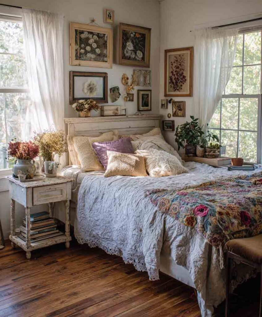 - Embrace mismatched frames, handmade quilts, and secondhand gems.