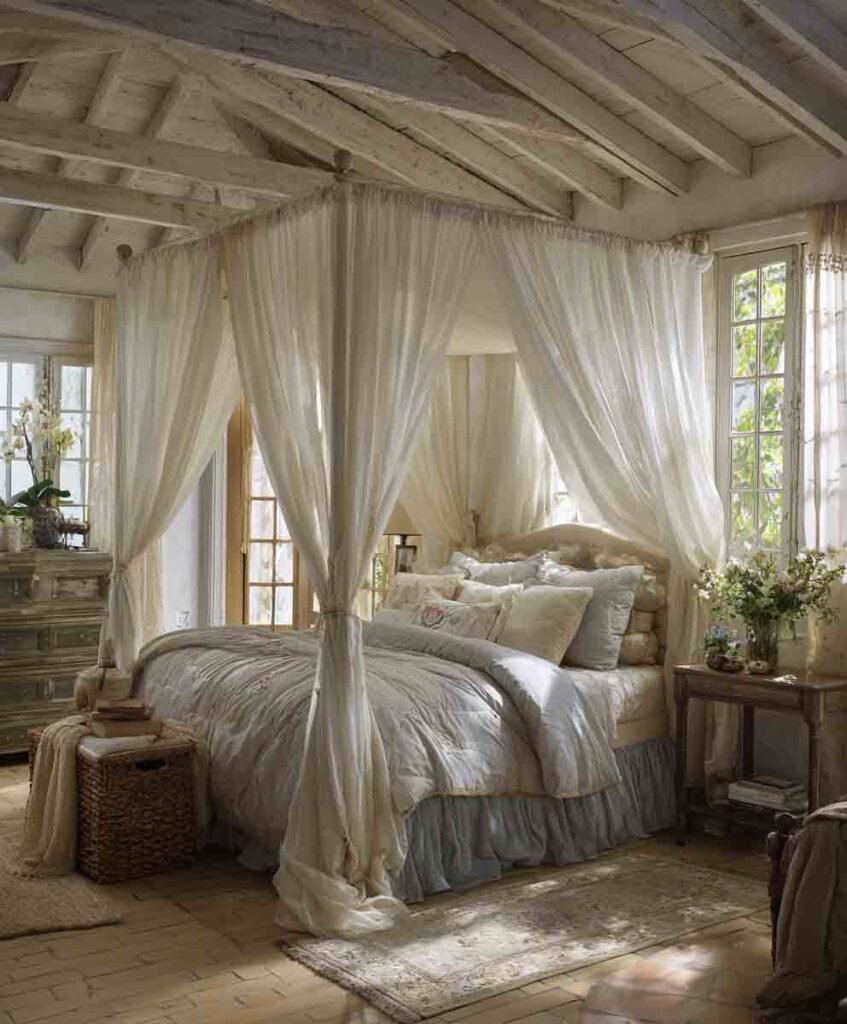 A wrought iron or vintage-style bed frame immediately brings that countryside charm.