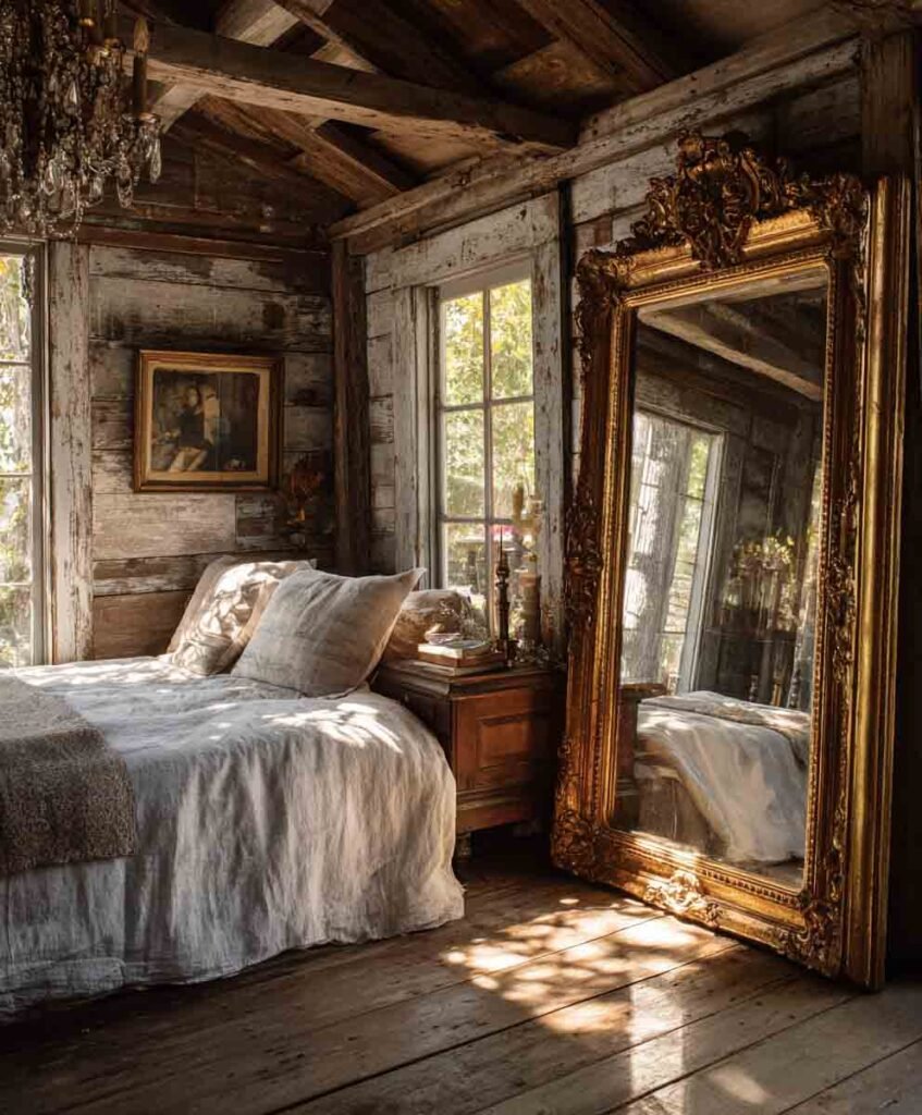 A little shine in a rustic room? Yes please. Antique mirrors add light, elegance, and that perfect worn-in feel.