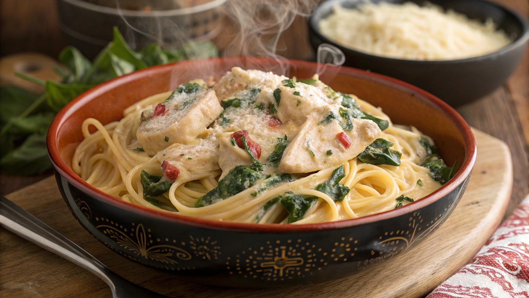 Tender chicken, lush cream sauce, and a twirl of spaghetti that actually feels indulgent—without wrecking your schedule. Toss it in the slow cooker before work, come home to a thick, silky, spinach-laced sauce that clings to every noodle.