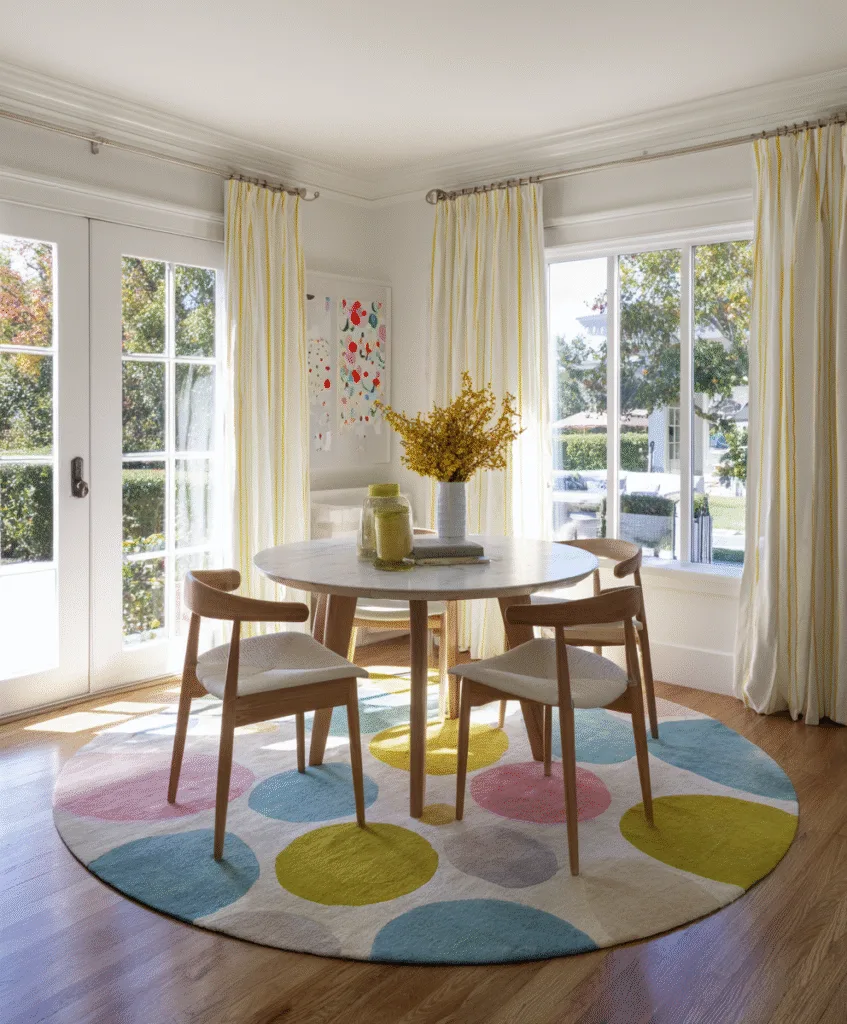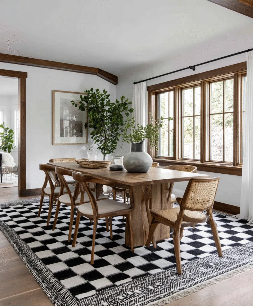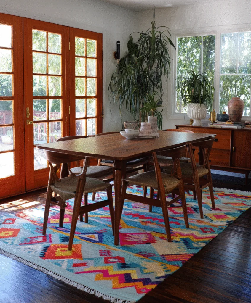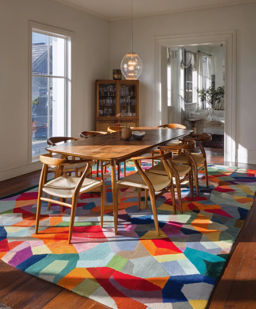 If your dining room is quiet in color, a bold geometric rug can give it energy without adding clutter.