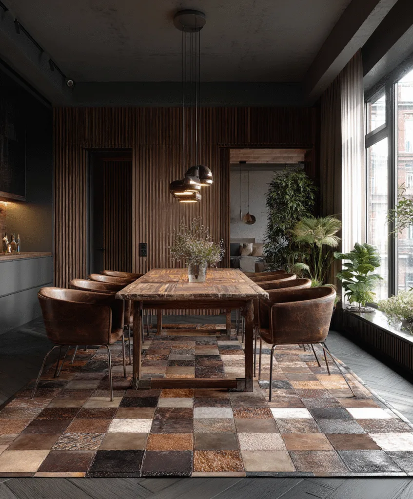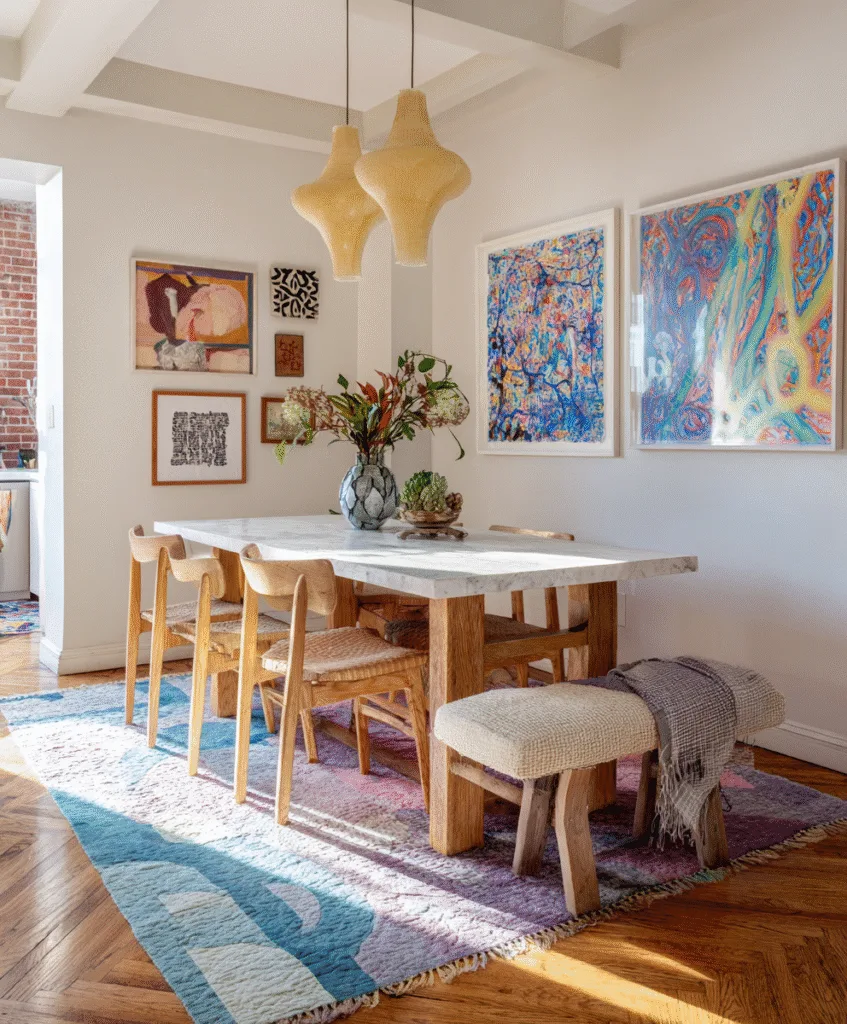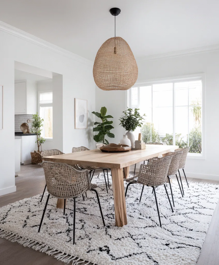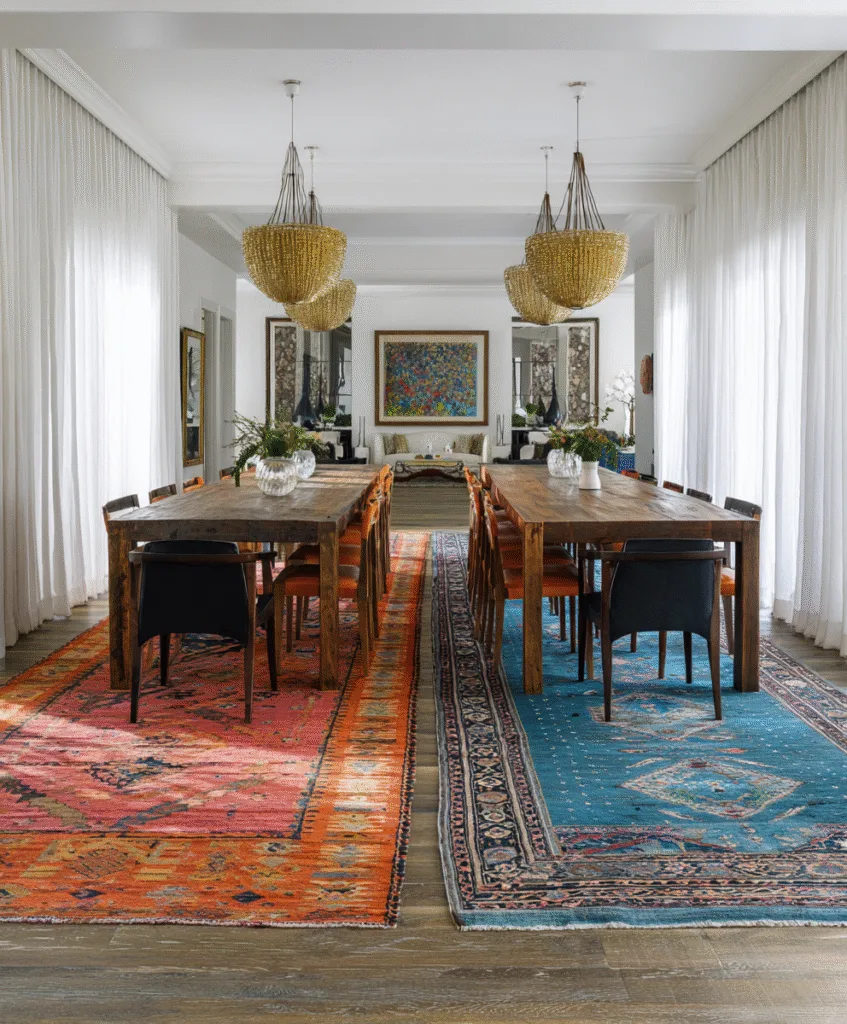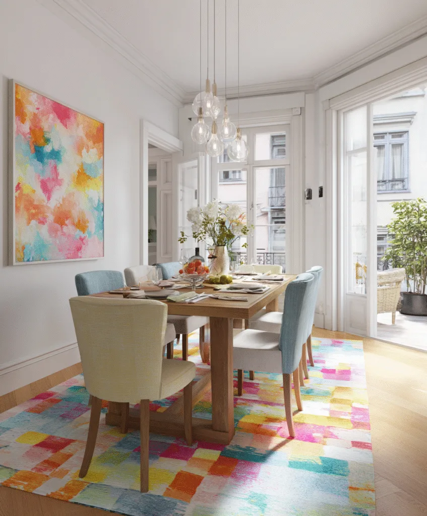 If your dining room is quiet in color, a bold geometric rug can give it energy without adding clutter.
