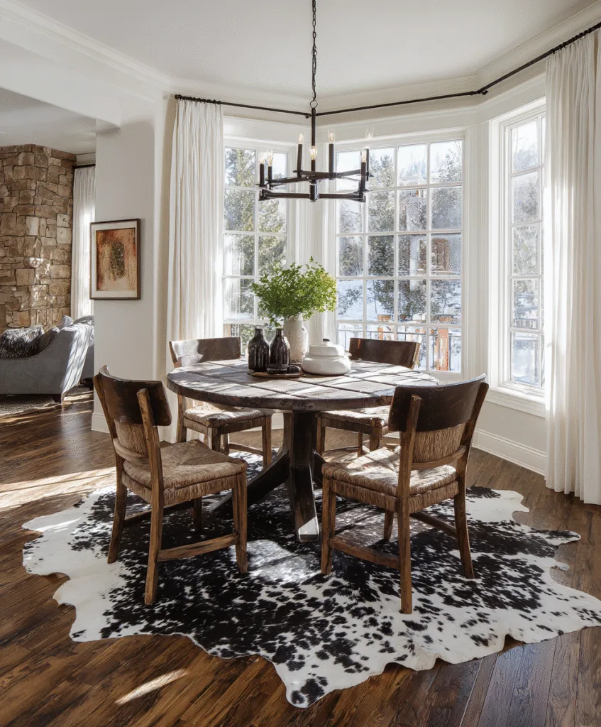 A faux cowhide rug in a dining room? Sounds odd, but it totally works in a casual setting.