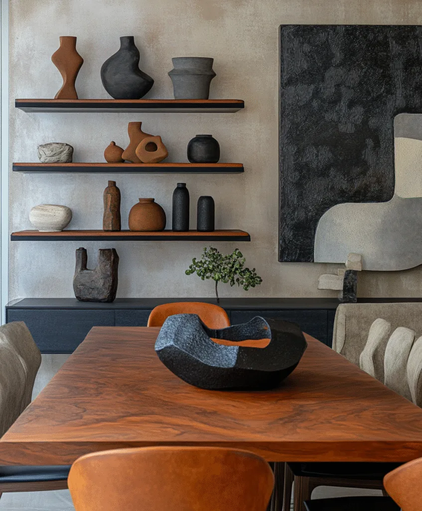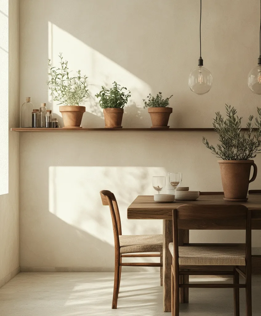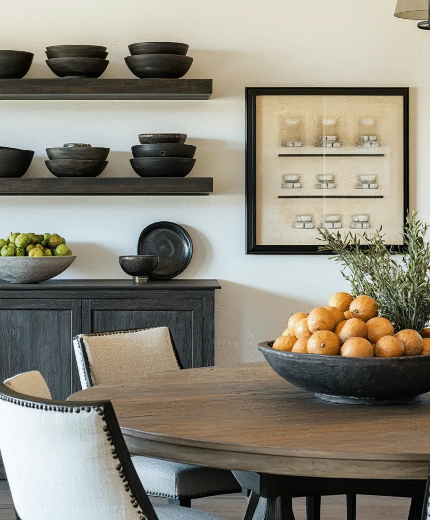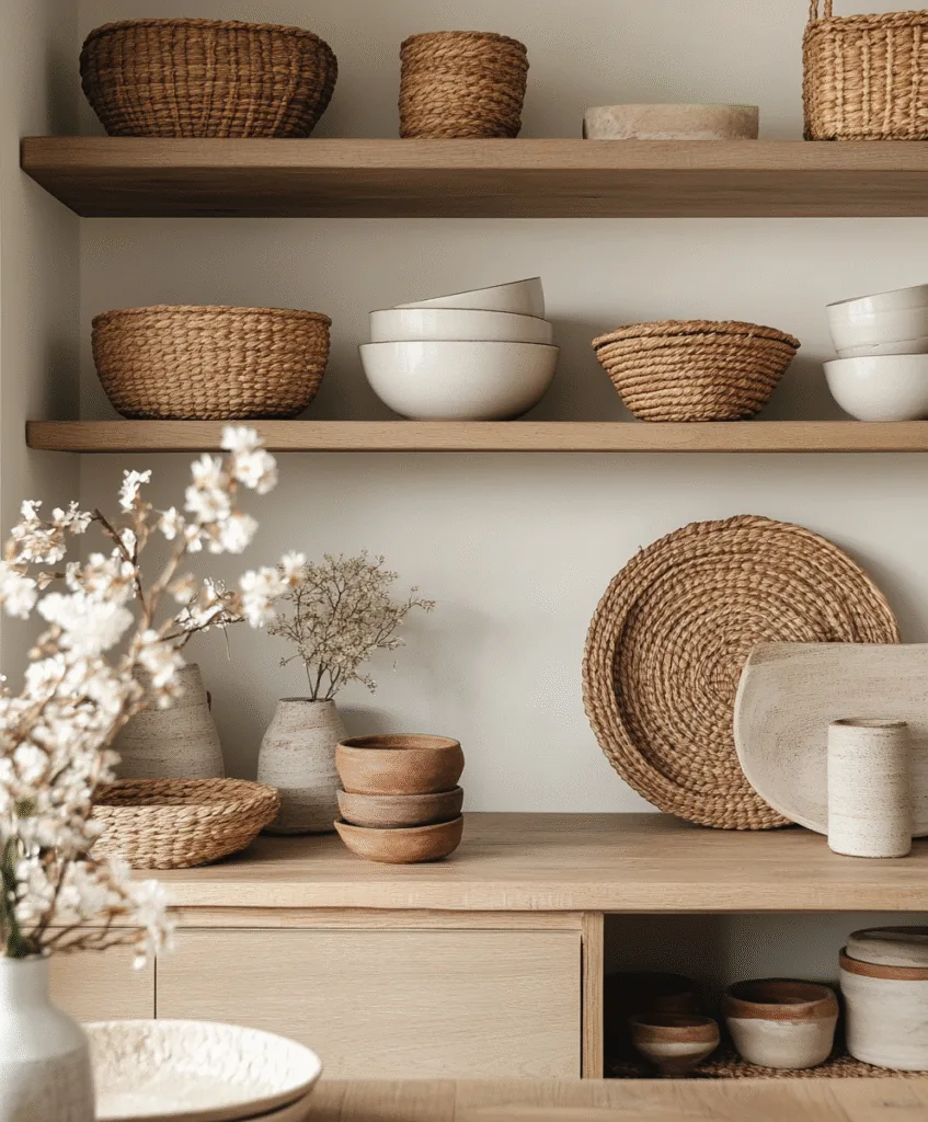 Think woven baskets, clay pots, driftwood pieces, or jute trays. Bringing natural materials onto your dining shelves can create a calm, earthy feel.