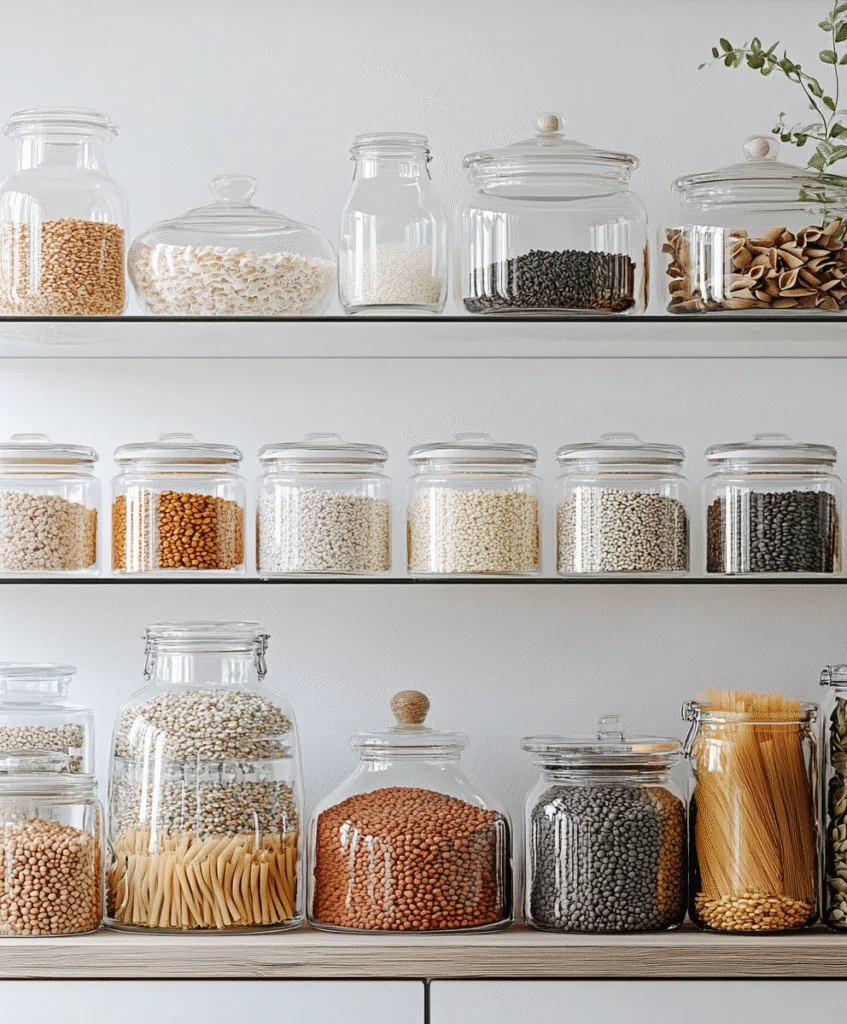 Use clear jars to show off colorful dried goods, think lentils, pasta, beans, or even candy.