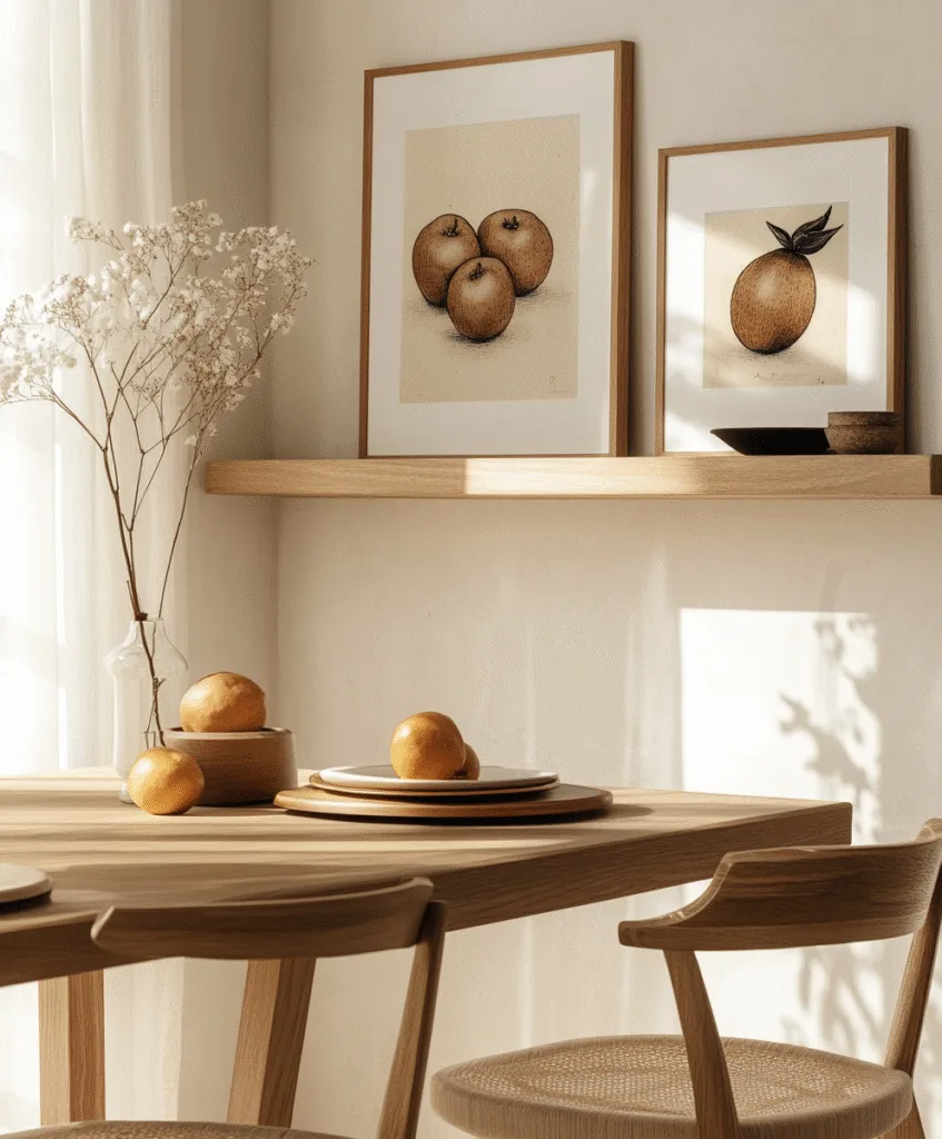 I love switching out seasonal prints or food-related art. Think vintage fruit illustrations or minimalist wine sketches.