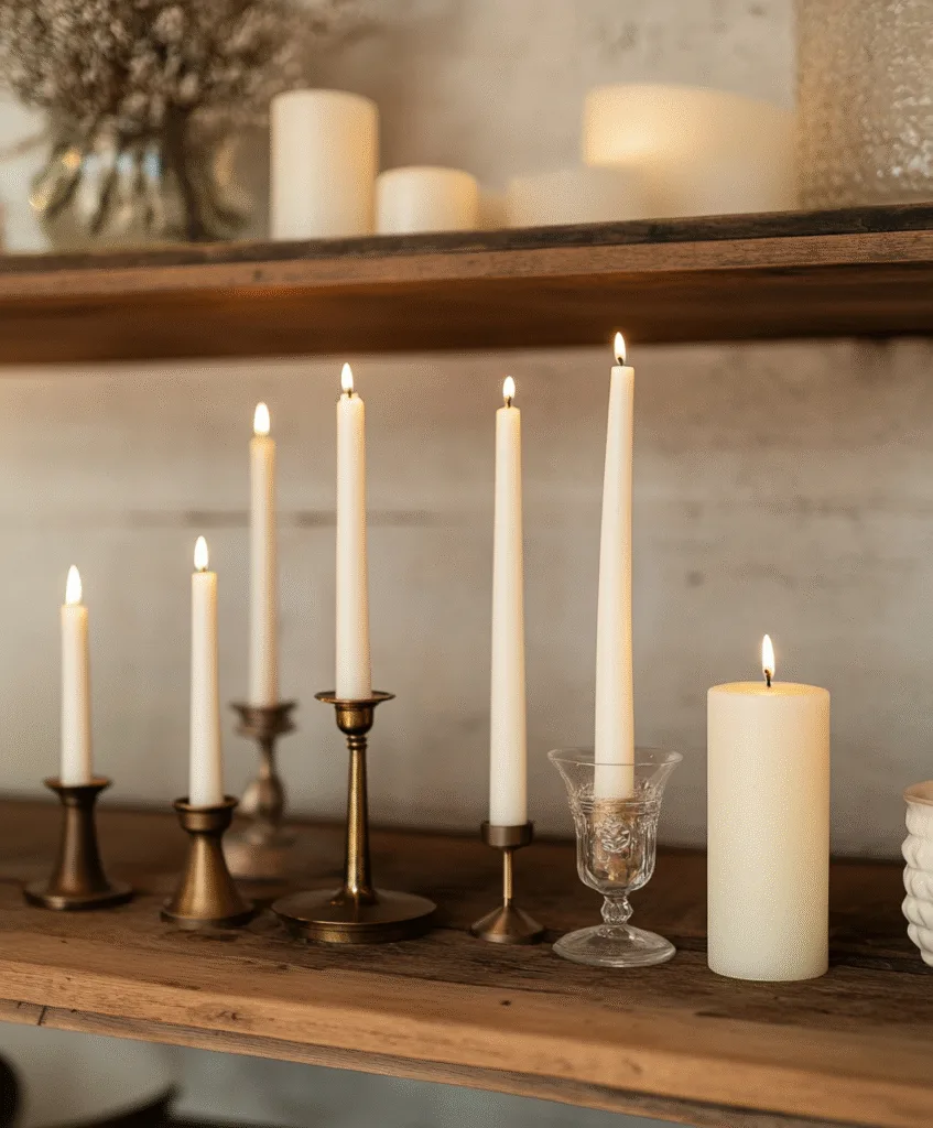 I like to group a few candles in different heights and styles, tapers, jars, even a pillar or two.