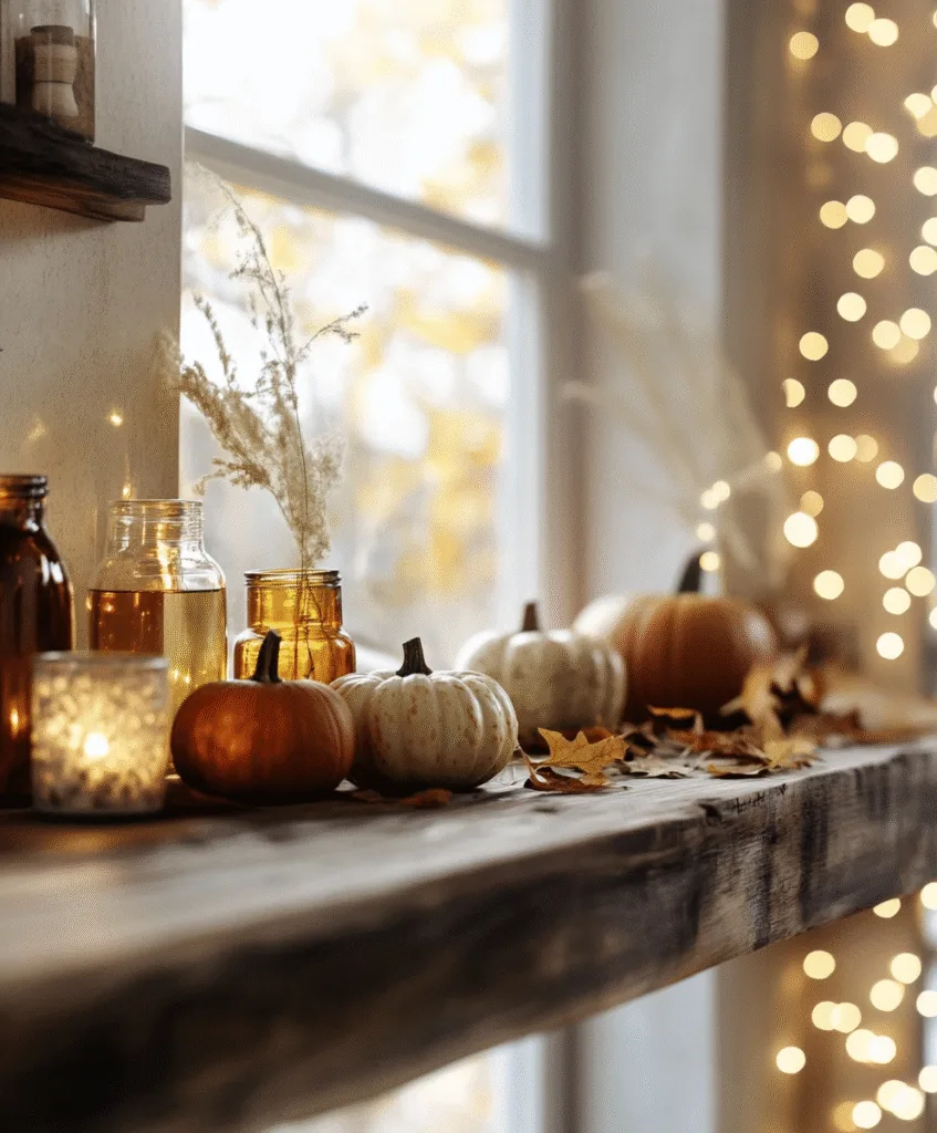 In fall, I bring out mini pumpkins and amber jars. In spring, it’s pastels and flowers.
