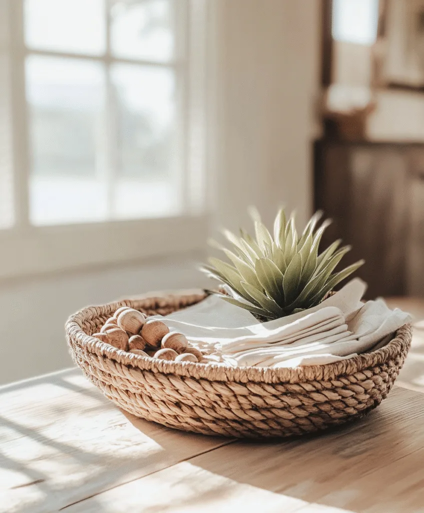 This one adds a cozy touch. I use a round woven basket and toss in a few different items, like wooden beads, a small vase, and a folded cloth napkin.