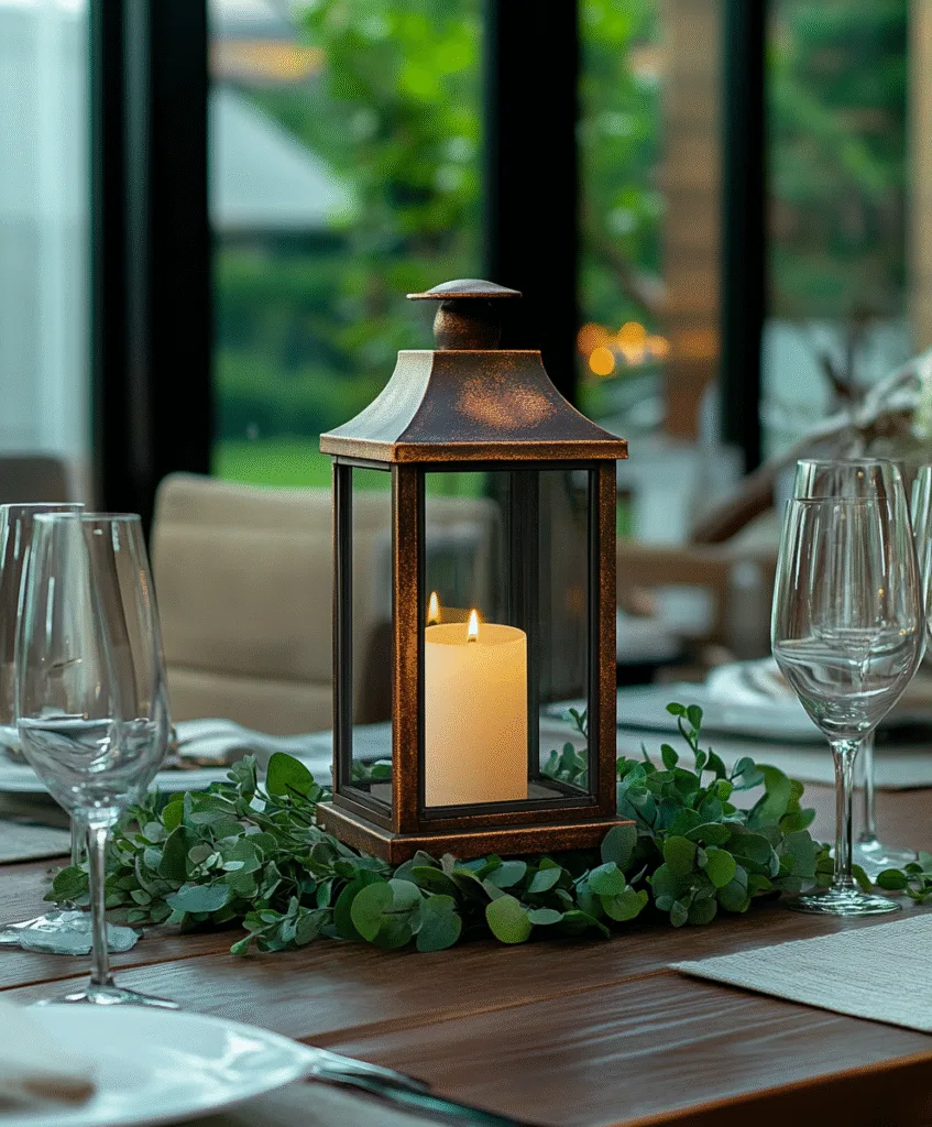 I found an old metal lantern at a secondhand store, and I use it as a centerpiece with a flameless candle inside.