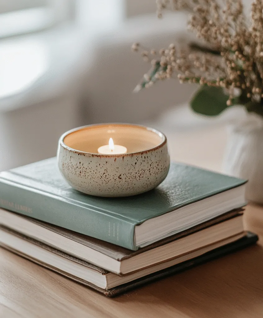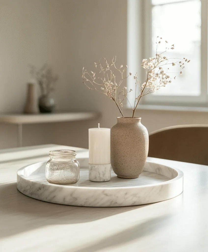 There’s something comforting about soft candlelight, even when it’s not lit. I like placing a few pillar candles of different heights on a small tray.