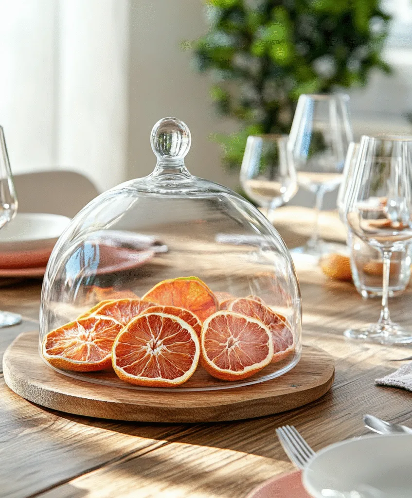 A glass cloche can make anything feel fancy. I’ve placed cupcakes inside, a stack of dried orange slices, even a bird’s nest I made with twigs.