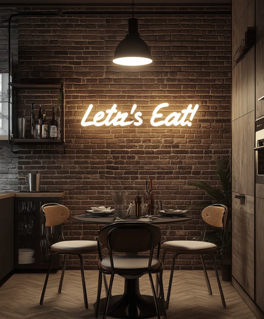 If you want a playful, modern twist—neon or LED script signs are seriously fun. We made one that said “Let’s Eat!” for our friends’ dining room and it’s now the backdrop of all their dinner selfies.