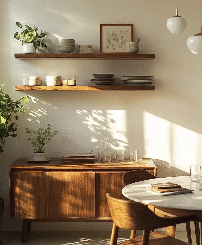- Choose floating wood shelves for a rustic vibe or black metal frames for a modern edge.