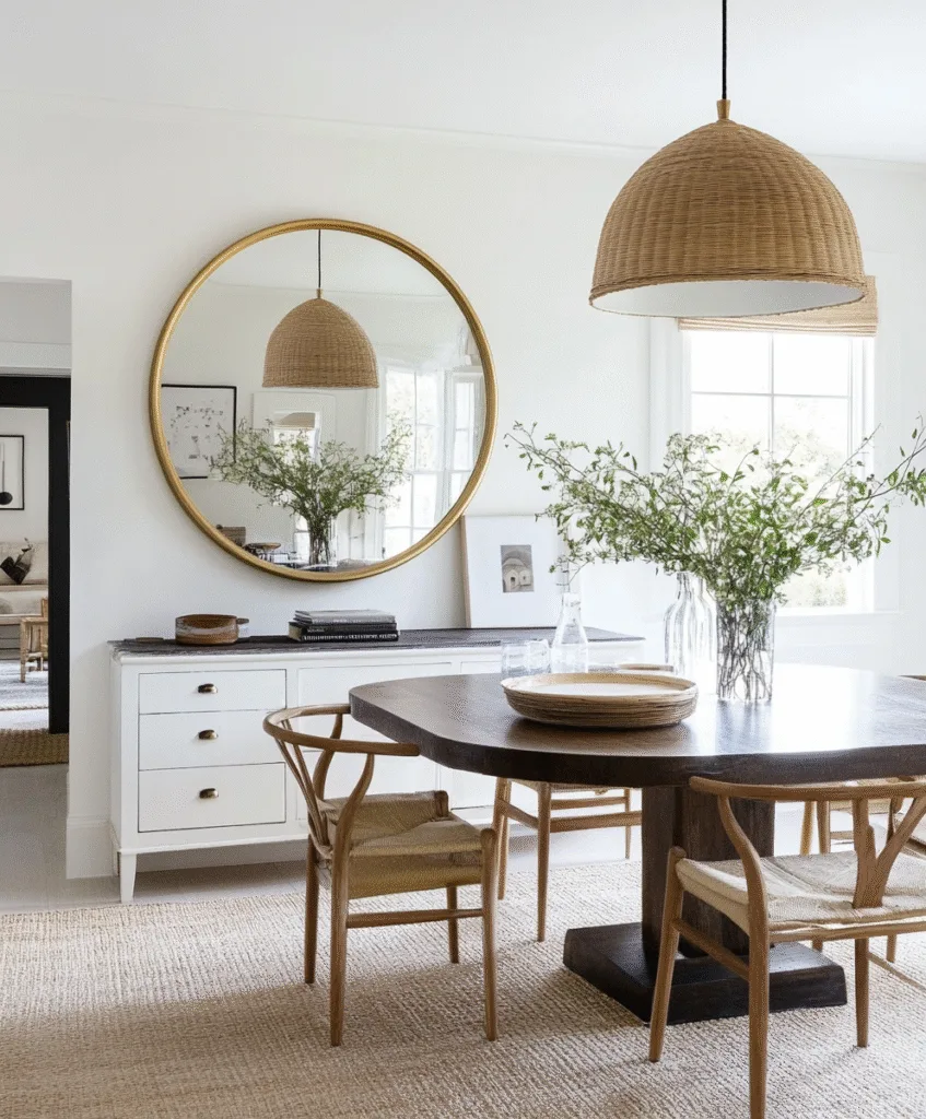 Okay, this one is magic. If your dining room feels a little tight or dark, adding a large wall mirror can totally change the vibe. I hung one opposite our window and BAM, instantly brighter and more spacious.