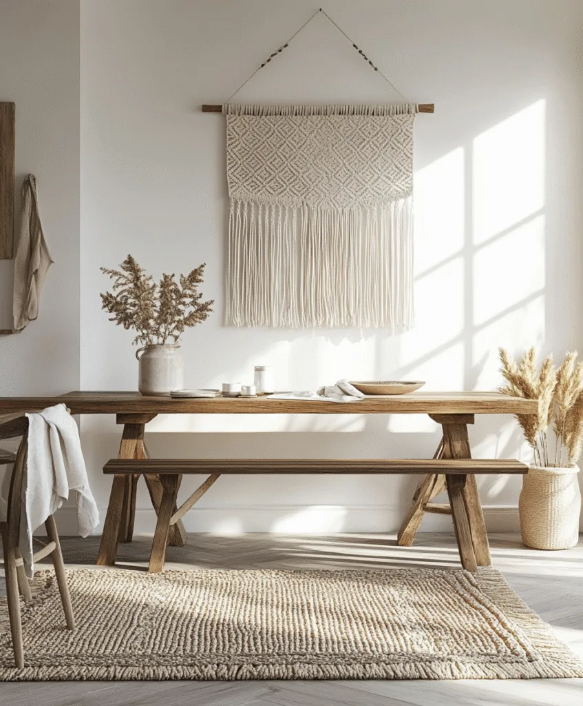 Bold Tip: Layer a textile behind a bench or sideboard to anchor the space and create a cozy backdrop.