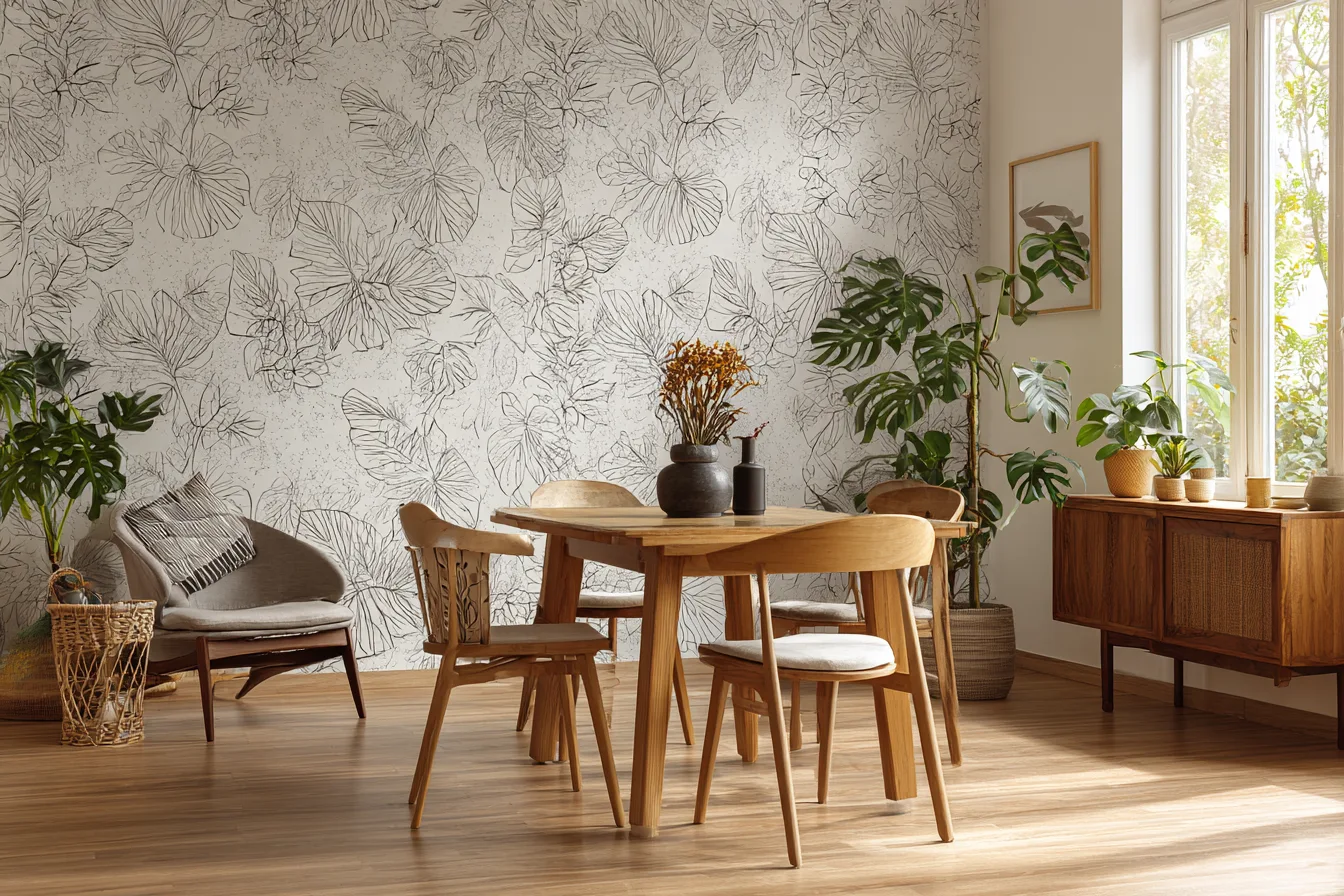 Leaves, trees, birds, these aren’t just for bedrooms. I added a botanical wallpaper with fern sketches in charcoal, and it instantly softened the hard lines of the table and chairs.