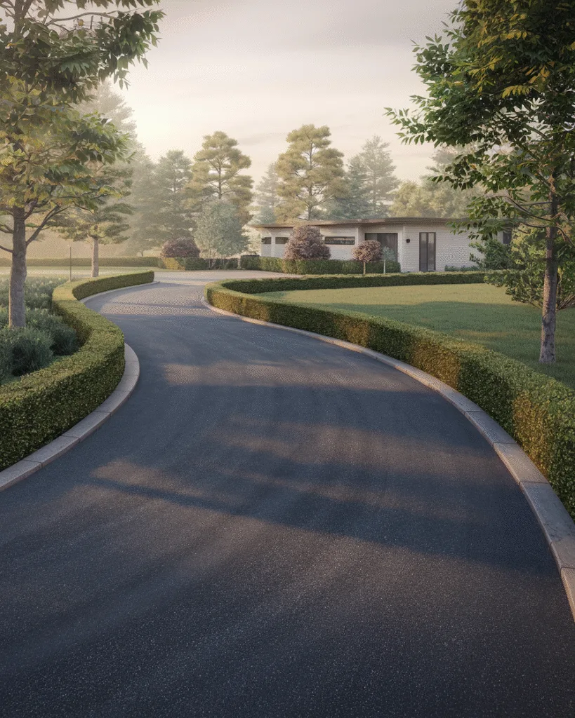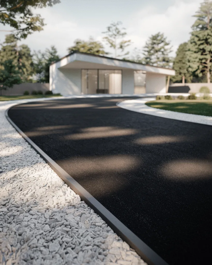 For a sleek, modern look, a blacktop driveway with white stone borders provides a clean, contemporary aesthetic that suits many home styles. The contrast between the dark asphalt and bright white stones adds sharp definition to your entrance.