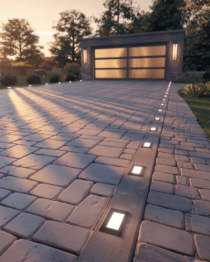 Consider adding solar lights or bollard lights along the edges of the driveway for a soft, energy-efficient glow.