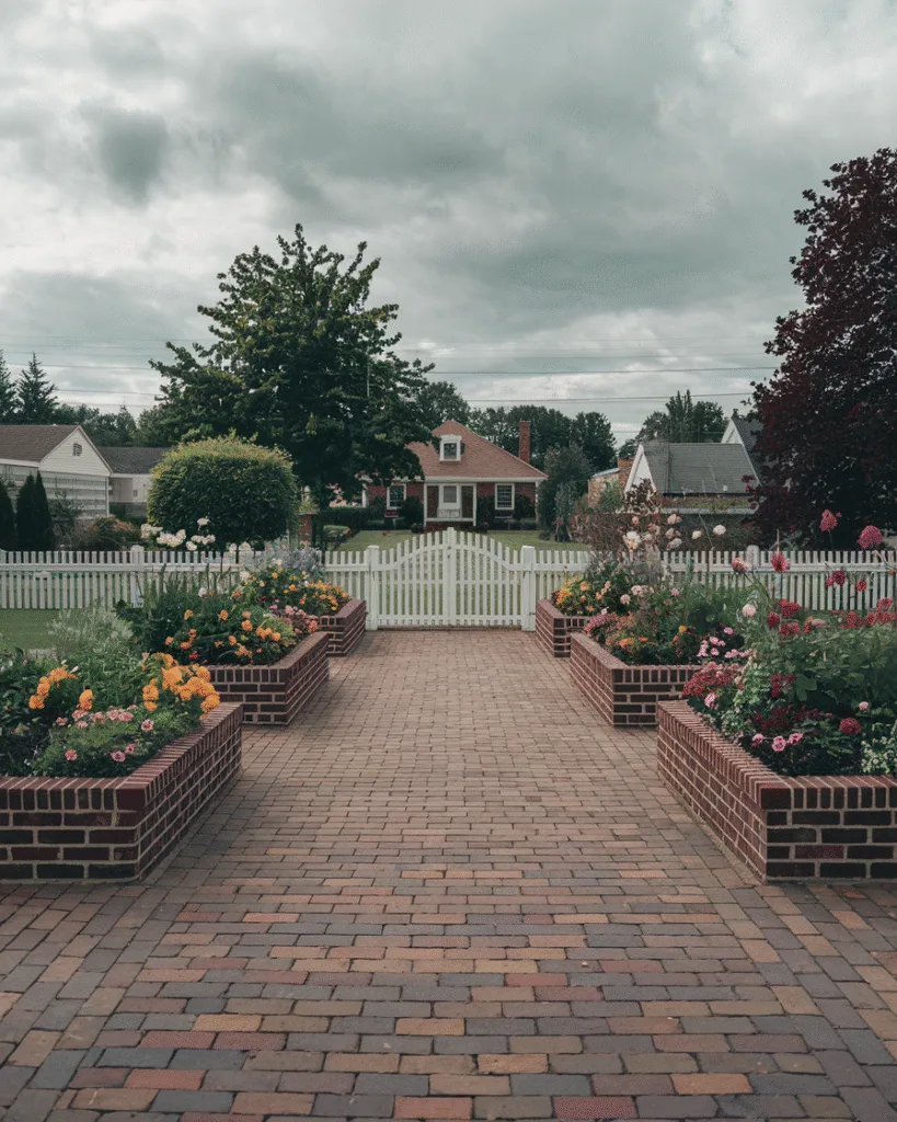 A brick driveway exudes timeless charm and looks even more beautiful when paired with symmetrical flower beds on either side. The combination of bricks and lush flowers adds both structure and vibrancy.