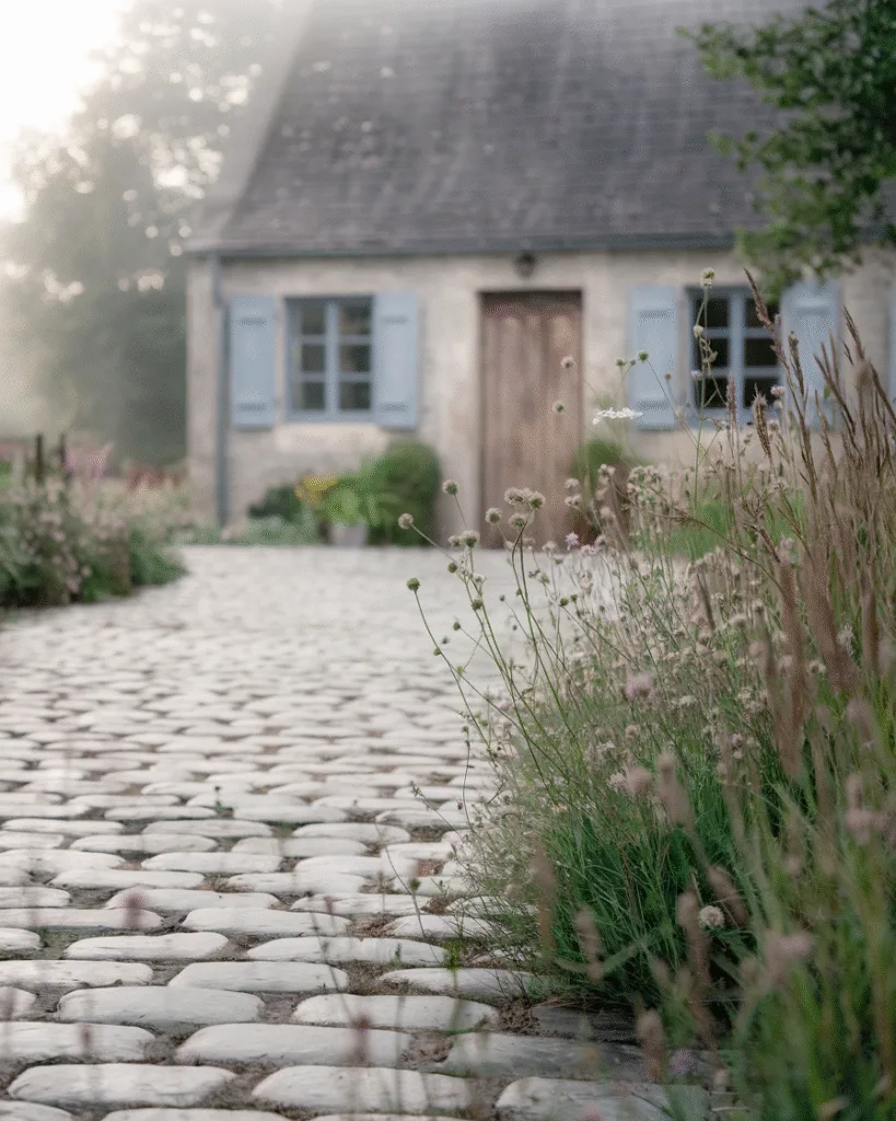 For a timeless look, a rustic cobblestone driveway with wildflowers brings a touch of old-world charm and natural beauty. This combination can make your driveway feel like a serene path through the countryside.