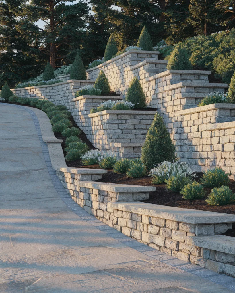 A driveway with tiered retaining walls adds dimension and structure to your landscaping. This design is perfect for sloped driveways or if you want to create a more defined, layered look with added depth.