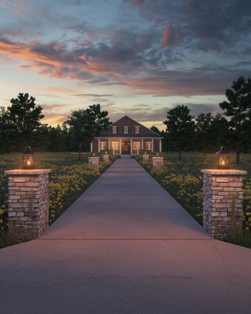For a welcoming and slightly grand entrance, add low stone pillars on each side of your driveway, topped with lanterns. This design works particularly well for homes with a more traditional, Mediterranean, or even colonial feel. The stone pillars provide structure, while the lanterns cast a warm, inviting glow.