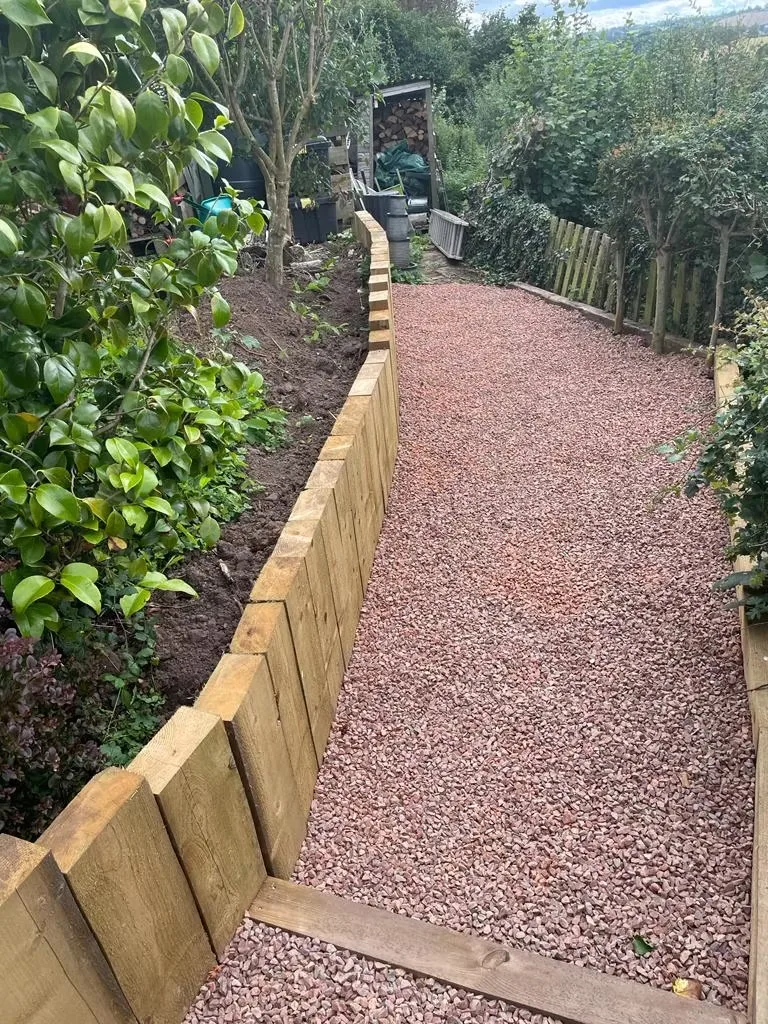 A driveway with wooden sleeper edging provides a natural, rustic charm. The wooden sleepers (large wooden planks) serve as the perfect border for your driveway, creating a harmonious look with surrounding plants and greenery.