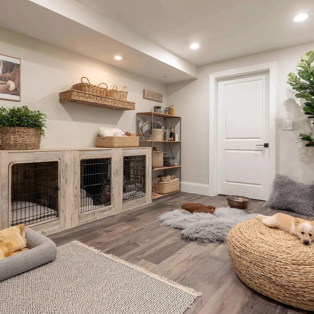 - Add built-in pet beds or a cute kennel nook.