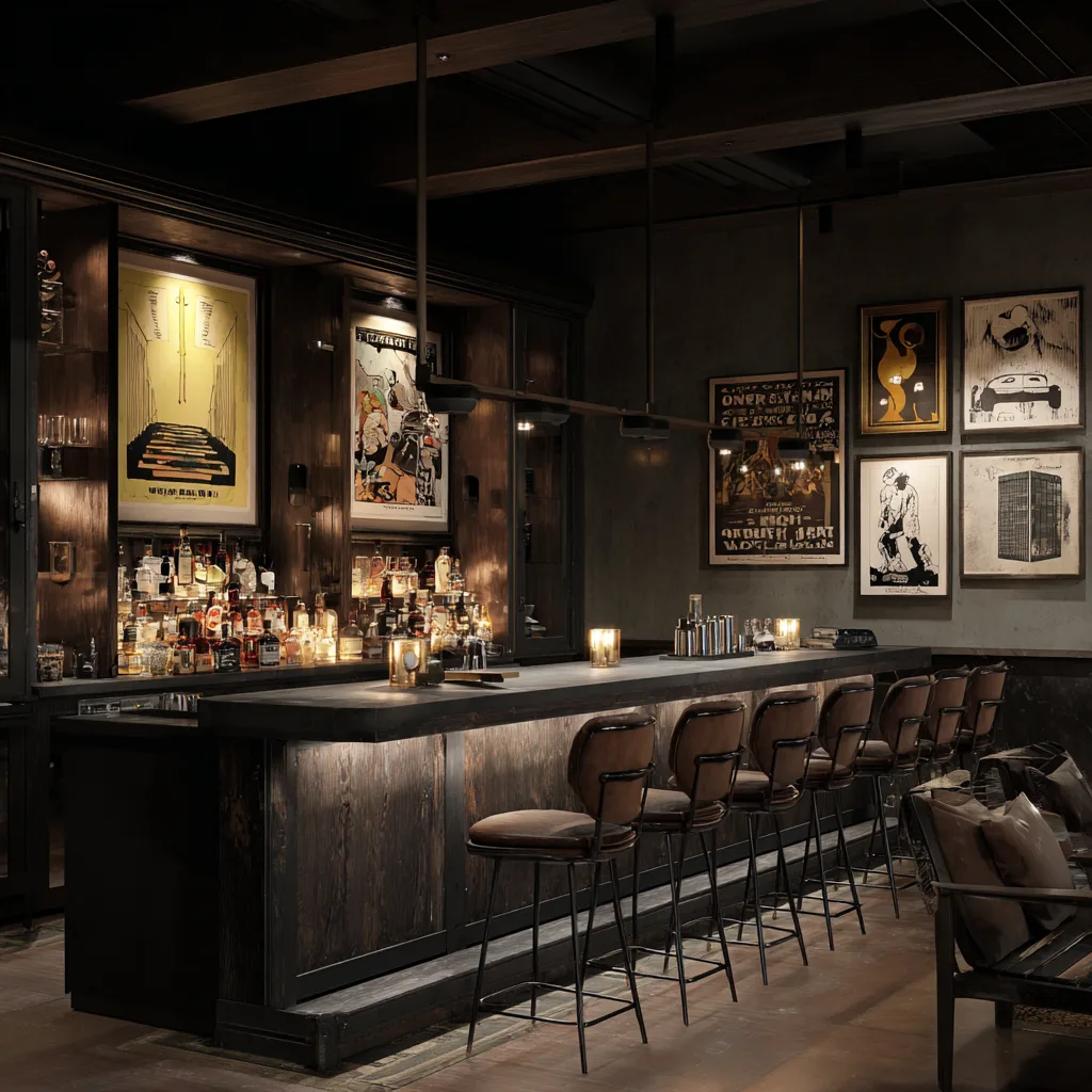 - Use moody lighting and dark wood for a speakeasy vibe.