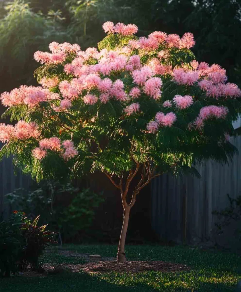 This one has a tropical vibe with almost zero effort. Soft pink blooms that look like tassels float above the tree like confetti. Kids always call it “the fuzzy tree,” and honestly, they’re not wrong.