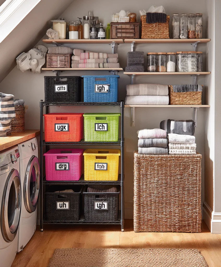 With kids, laundry piles up fast. I added a basket tower and labeled each one: lights, darks, towels, and “ugh” (you know the ones).