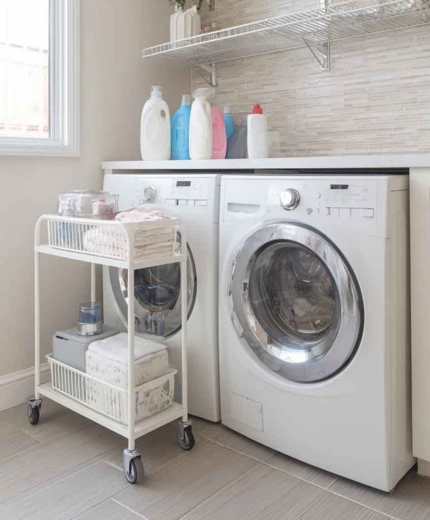 I had this awkward space between the washer and dryer that just collected lint and socks. Then I found a slim rolling cart that fit perfectly in that gap.