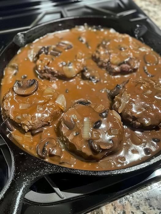 Return the hamburger steaks to the skillet and simmer in the gravy for 5–7 minutes.
