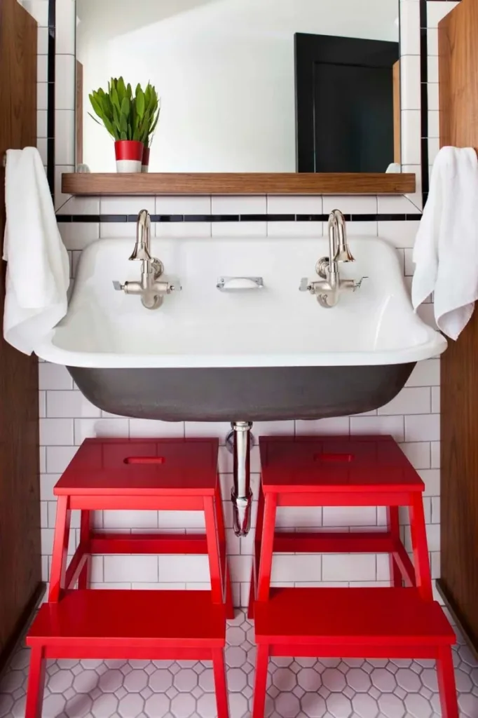 Adding bold step stools, like these standout red ones, brings functionality and a fun splash of color to the space.